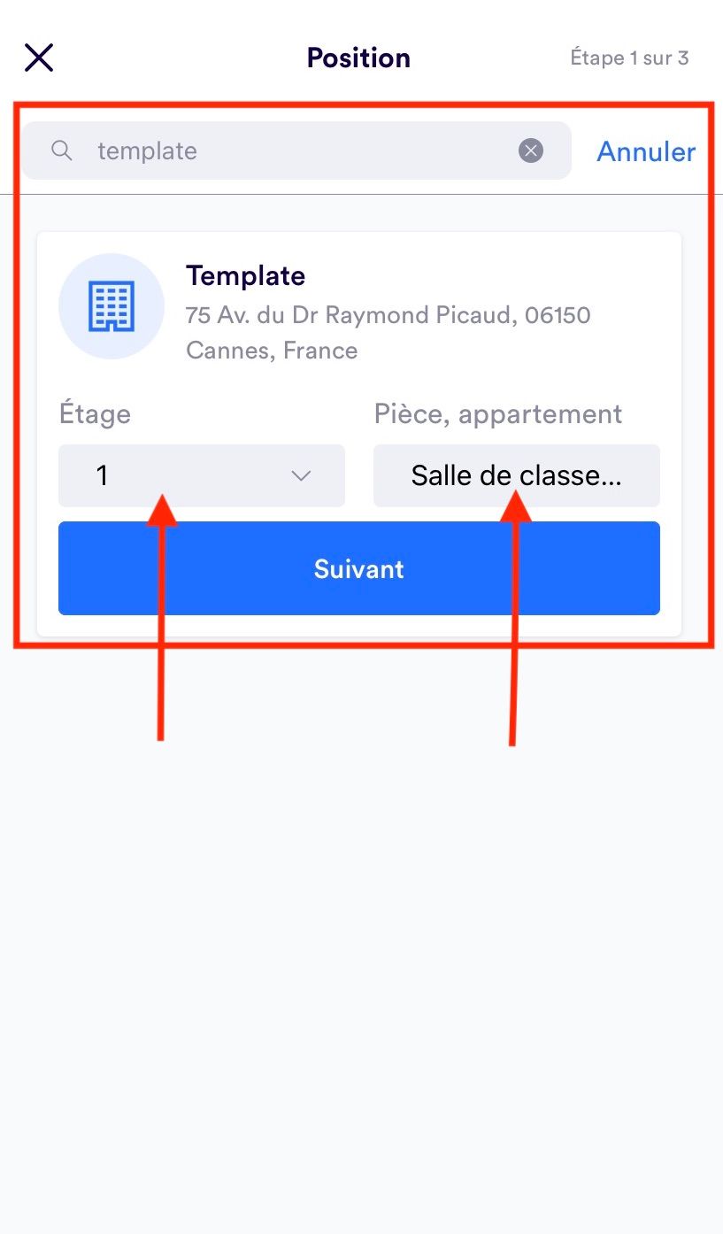 Renseignez l’étage et le lieu de votre demande et cliquez sur suivant. A noter que l’étage et la pièce sont optionnels car certaines demandent sont générales et ne s’appliquent pas à un espace.