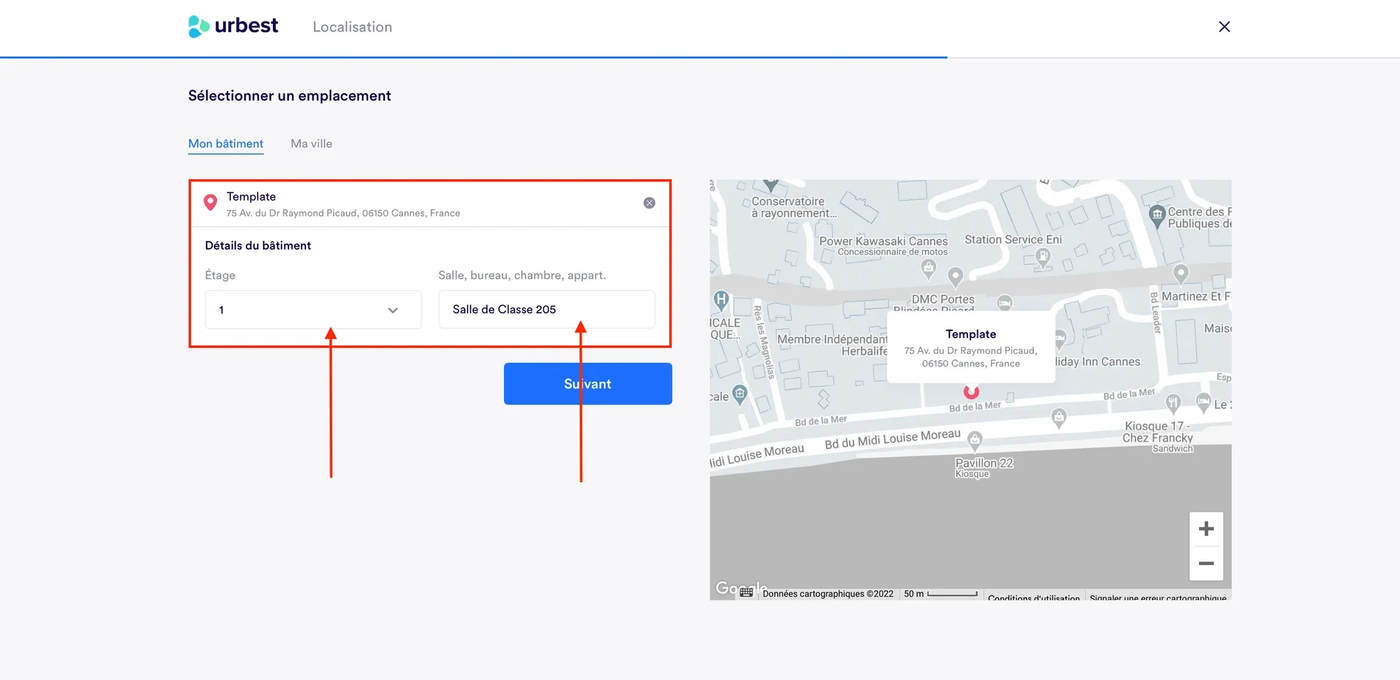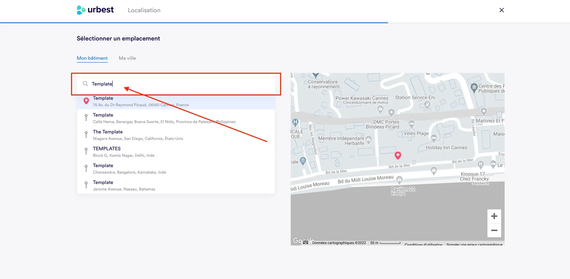 Écrivez le nom de votre site dans le champ de recherche pour accéder à la liste des bâtiments, puis sélectionnez le bâtiment de votre choix.
