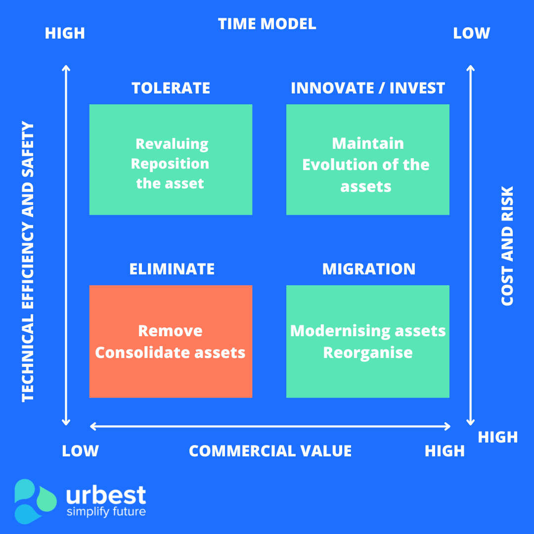 The TIME model allows you to classify software into 4 categories (Tolerate, Invest, Migrate, Eliminate) and thus helps you in your decision-making to know where to invest and where you should withdraw.